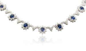 >>>> Only $25,895.00 Best Buy This is a stunning diamond & blue sapphire 18k white gold necklace! This fantastic necklace, designed in Italy, contains oval cut blue sapphires of exquisite color weighing 9.27 carats total and round brilliant cut white diamonds of F color, VS2 clarity and excellent cut and brilliance weighing 10.94 carats total. The necklace measures 16.25 inches in length and 10mm at the widest point.