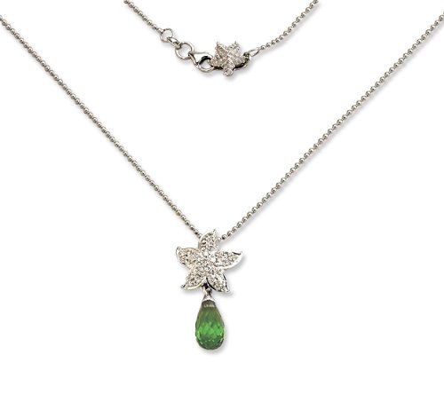 18K White Gold Designer Starfish Pendant with Pave Diamonds .24ct and Peridot Briolette with 18" Bead Chain