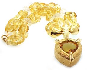 >>>> Only $3,450.00 Best Buy This artist made citrine and gold choker necklace is about 10 years old. This is a one of a kind piece and is artist signed. The choker style necklace is fashioned from 14k yellow gold. The bead necklace portion is made up of tumbled citrine beads and carved white quartz rondelle spacers. The beads are light yellow citrine, lighter and less yellow than my pictures. The large citrine inside of the gold heart is 40.00 Cts. and is completely eye clean VVS in clarity with a beautiful deep golden citrine color. There are 15 small round full cut accent diamonds spraying out from the large citrine. These diamonds are eye clean SI clarity and bright white H-I color. They are well cut for maximum brilliance. The total weight is .40 Cts. The clasp is a small toggle style and is also 14k gold. The necklace measures 16 inches long. The beaded section is 1 inch wide. The gold heart measures 1 1/2 x 1 1/2 inches, not including the bail. The heavy gold bail and connectors above the heart measure 1 1/2 x 5/8 inches. This necklace weighs more than 5 ounces overall. When I put just the heart and bail on my scale it weighs 54 grams. The appraiser estimated the gold weight conservatively at 28 grams, which I feel is well under the true weight but that is AT LEAST what it would weigh. I cannot make out the makers mark but it is signed and has a copyright mark on it. The retail replacement value is $3450.00 and the independent appraisal is included when this necklace is included.